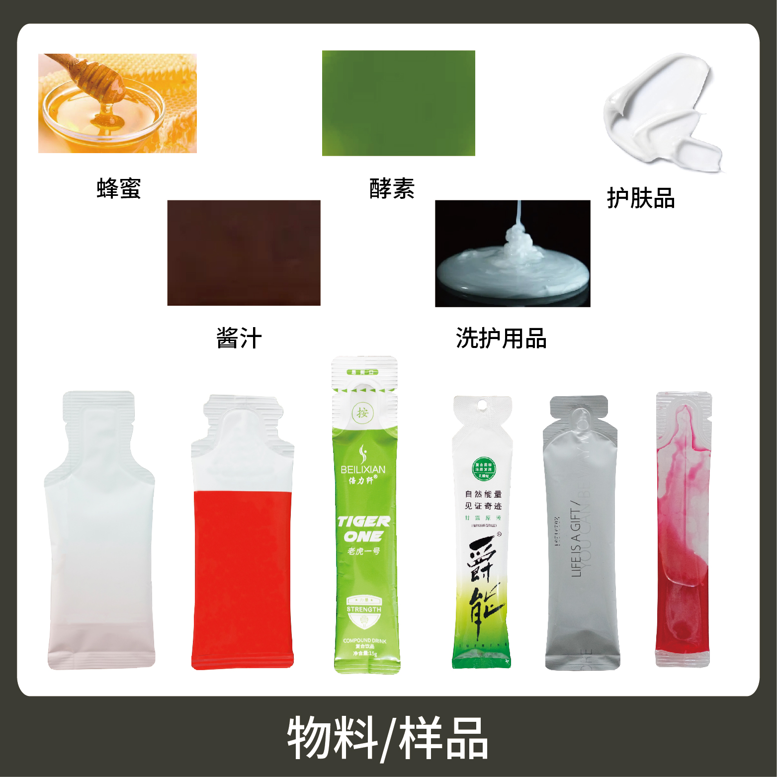 適用于各行業(yè)中酵素、果汁、漱口水、洗護(hù)用品、染發(fā)劑、化妝品小樣等醬料、液體物品的異形袋計(jì)量包裝。